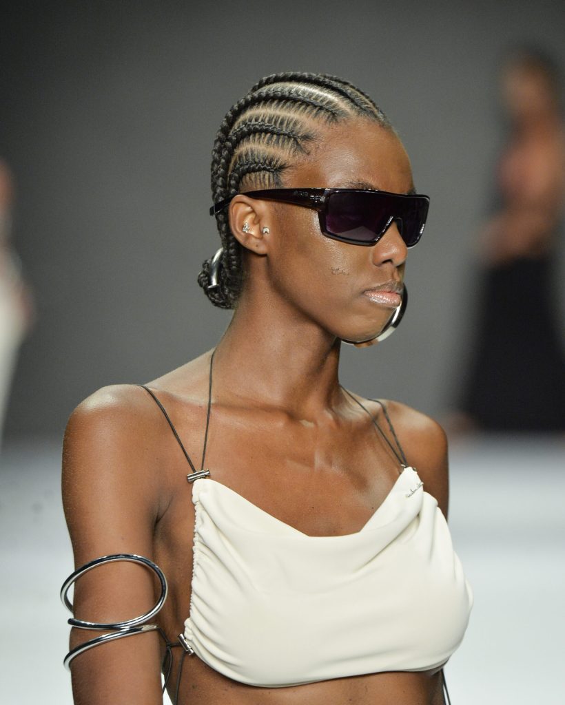 A colaboração com a Evoke introduz óculos esportivos que contrastam com a sensualidade acentuada dos looks, enquanto os acessórios de Carlos Penna dão continuidade à parceria iniciada em Londres, com peças que dialogam diretamente com as formas metálicas da coleção.