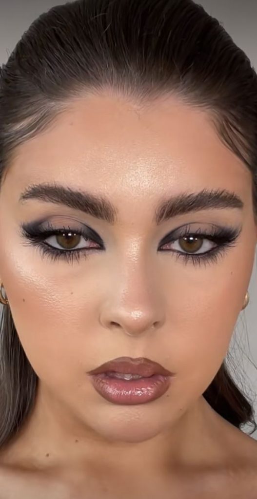 Na beleza, o destaque vai para os olhos bem definidos e expressivos, reforçando a conexão entre moda e maquiagem. O visual se completa com força, atitude e presença.