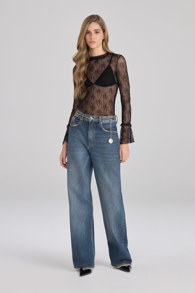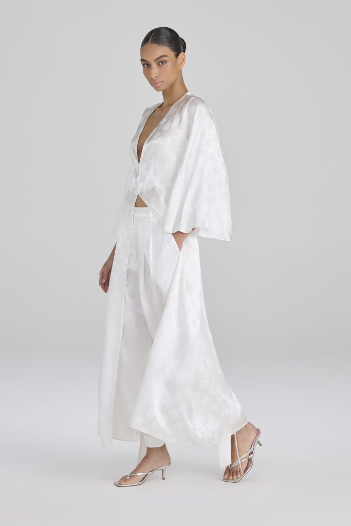 tEntre os principais materiais da coleção estão viscose fluida, jacquard fluido, jacquard metalizado, malha rendada e tule com paetê bordado – uma seleção que reforça a sofisticação do drop e a intenção de oferecer texturas e luminosidade variadas.